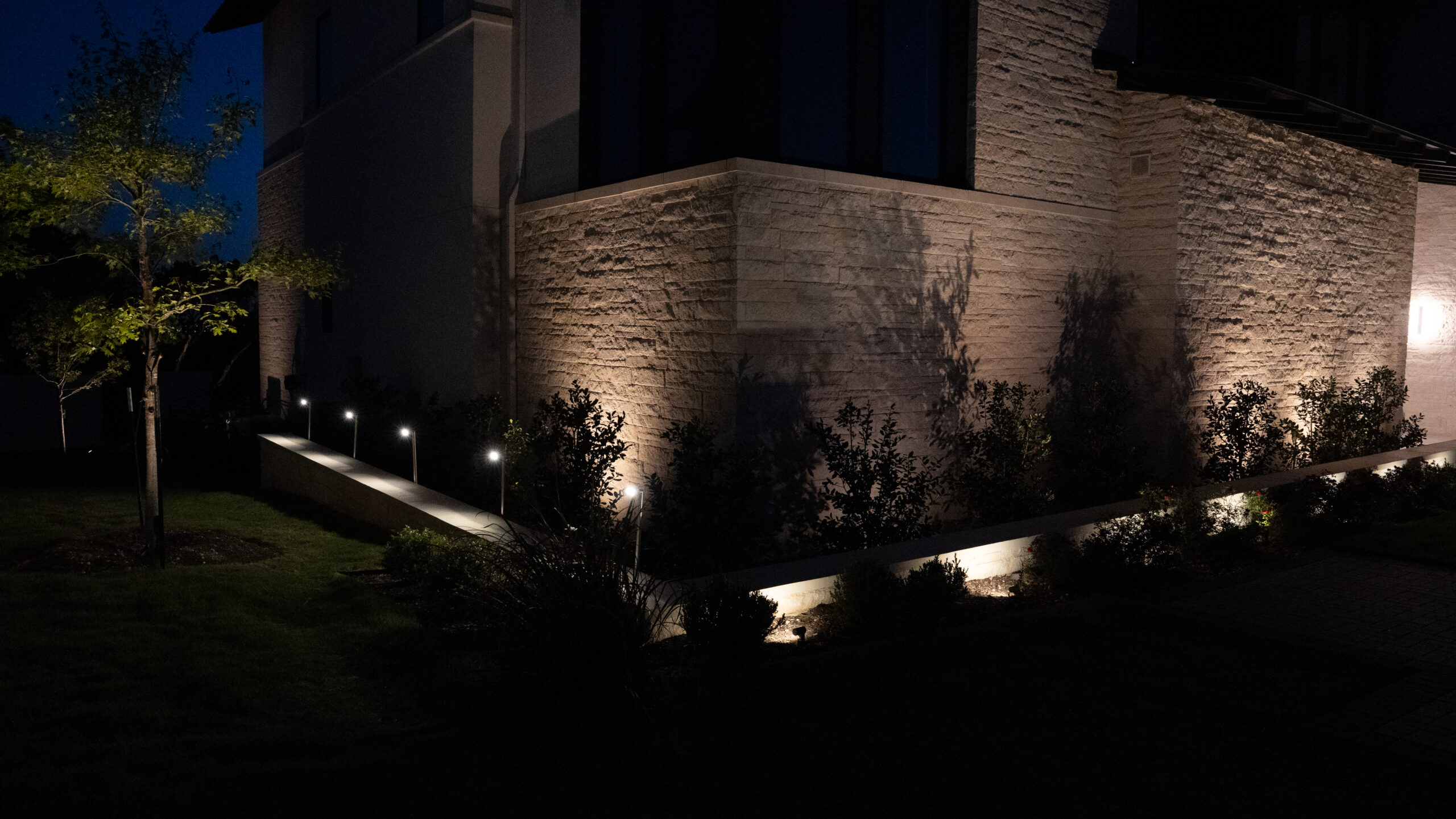 When planning landscape lighting for your yard, spacing your lights correctly is key to creating an even and attractive effect. For outdoor home lighting, a common guideline is 6 to 8 feet apart for path lights, while accent lights for trees, shrubs, or architectural features may be placed 8 to 12 feet apart, depending on the size of the feature and the brightness of the bulbs. For optimal results, our residential lighting experts will carefully assess your property and place your lighting in the best positions to highlight your landscaping, enhance safety, and create a balanced, inviting look.
